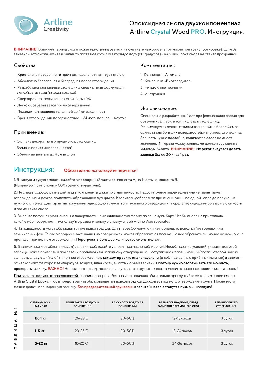 Artline Wood PRO — эпоксидная смола, которая идеально подходит для заливки изделий с использованием различных пористых материалов (дерева, бетона) и любых других, где нужен высокий заливочный слой и максимальная дегазация. Смола имеет продолжительный срок жизни (~12 часов), благодаря чему выход воздуха происходит дольше и эффективней. Благодаря низкой вязкости она может углубляться в трещины и поры материала, тем самым улучшать сцепление.