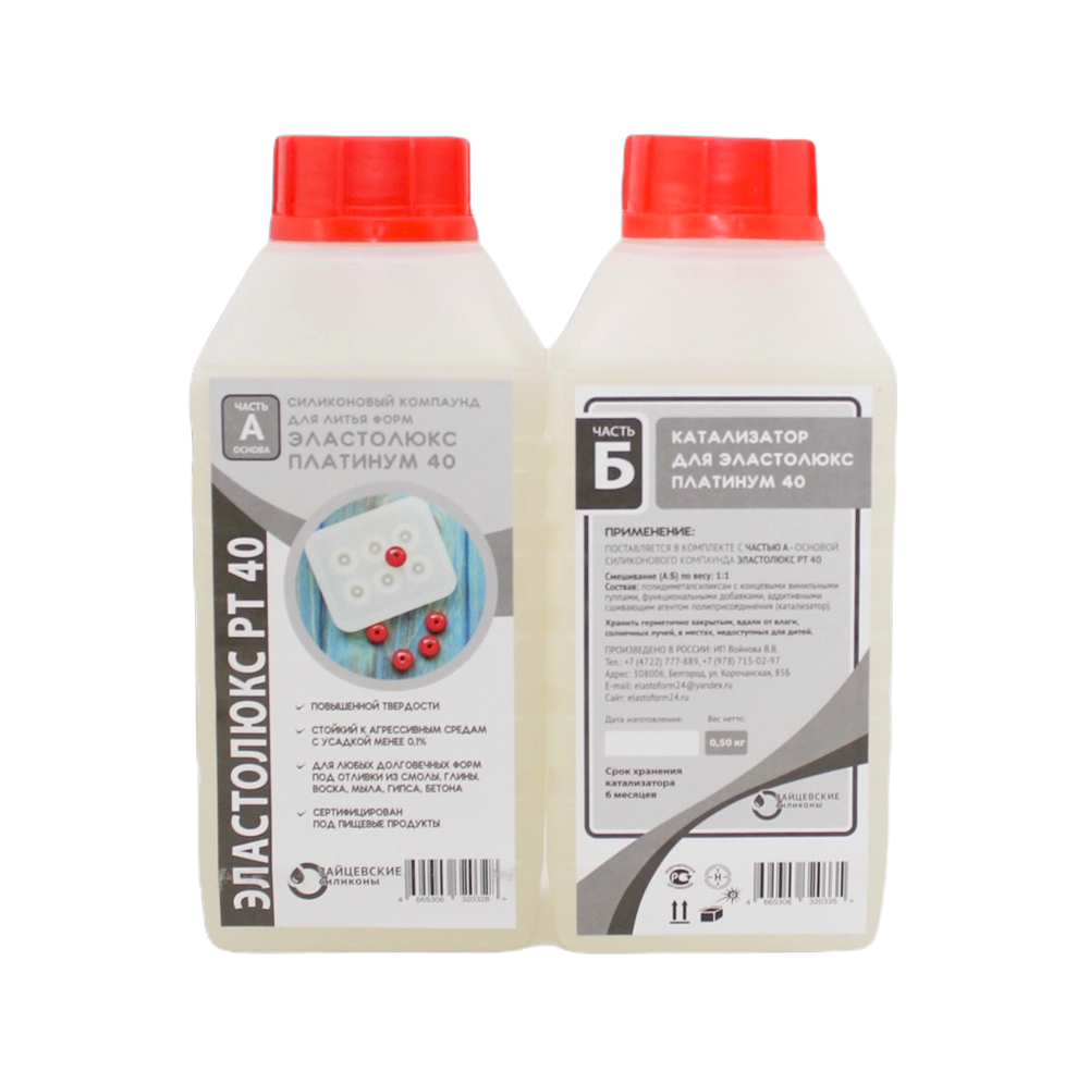 Платиновый силикон Эластолюкс Платинум 40 ― безусадочный, стойкий и нетоксичный силикон, повышенной твердости и жесткости. Платиновый силикон идеален для крупных изделий благодаря своей безусадочности! При работе с пластиками нужна разделительная смазка. Силиконы на платиновой основе применяются там, где важны стойкость к агрессивным средам (для отливок из пластиков, полиуретанов, полиэфирных, эпоксидных и других смол, для щелочей), безусадочность (при изготовлении больших изделий), отсутствие запаха (для пищевых продуктов) Платиновый силикон Эластолюкс Платинум предназначен для изготовления любых сложных высокоэластичных долговечных форм: для искусственных камней, мыла, свечей, смол, гипса, парафинов, полимерной глины и пищевых продуктов, мастики и вайнеров.Технология работы с платиновым силиконом: