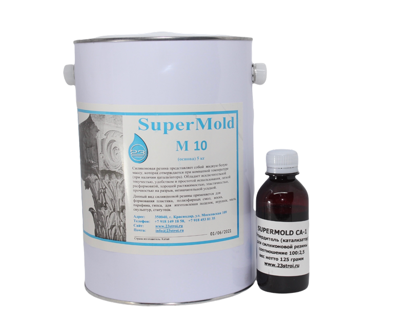Двухкомпонентная силиконовая резина: жидкий силикон и отвердитель на основе олова ,с разной вязкостью и твёрдостью по Шору А (10,20,25,30,40), отверждается при комнатной температуре , соотношение компонентов 100:2.Обладает исключительной текучестью, удобством и простотой использования, лёгкой расформовкой. Хорошая растяжимость, эластичность, прочность на раздир, незначительная усадка. Высокая тиражируемость и долговечность эксплуатации.Силиконовая резина для формования полиуретанов, полиэфирных смол, штукатурки, воска, парафина, гипса, бетона, жидких пластиков, мыла. Для производства сувенирной продукции скульптур, статуэток и прочих поделок Рекомендации: Допустимо механическое, а также ручное смешивание. Перед использованием тщательно перемешайте основу (компонент А) и тщательно взболтайте катализатор (компонент В). Перед тем, как смешивать компоненты, убедитесь, что компаунд имеет комнатную температуру.