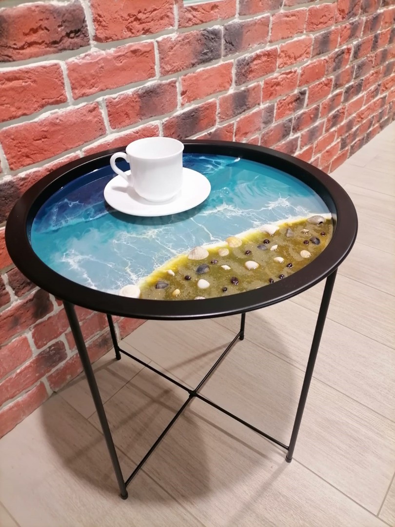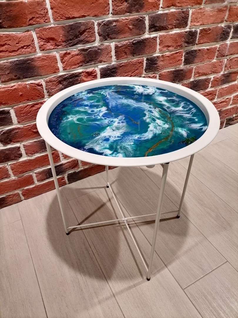 - Далее мы наглядно покажем, как нарисовать эпоксидной смолой картину на столике-подносе.