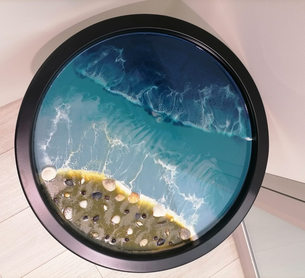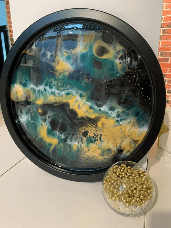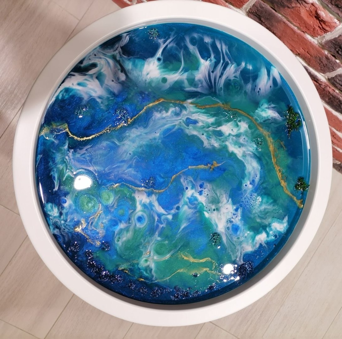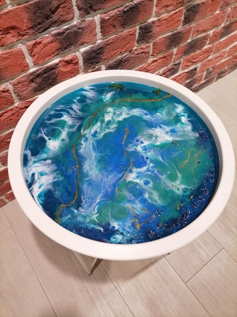 - Все материалы, а именно: эпоксидная смола, красители, добавки и сам столик-поднос черного или белого цвета диаметром 47 см в общем и 42 см - именно картины, вы можете выбрать технику рисования: Море, Космос, абстракция, ваш собственный дизайн по примеру и др.